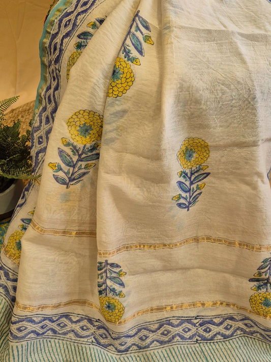 Blue Beige Soft Chanderi Silk Block Printed Suit Dress Material