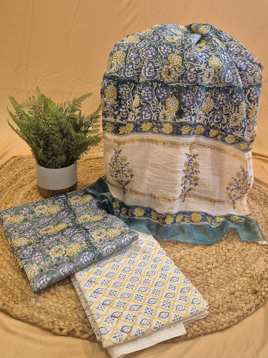 Blue Floral Soft Chanderi Silk Block Printed Suit Dress Material